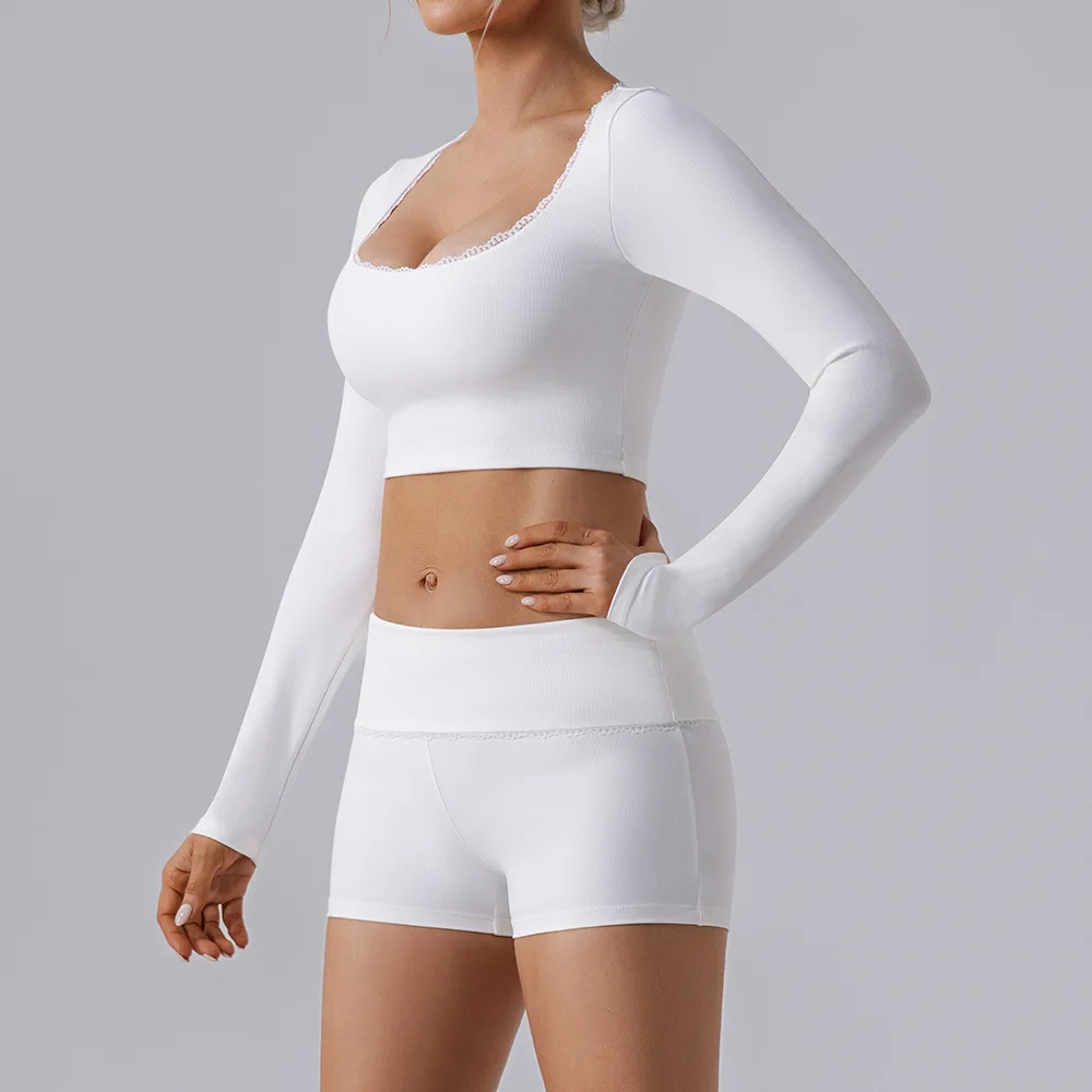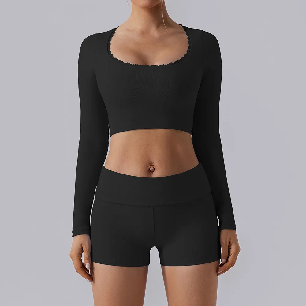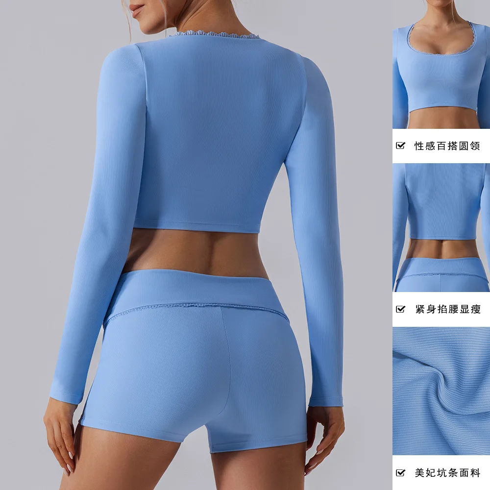 Ribbed Slim Fit Breathable Quick Dry Long Sleeve Crop Training Running Top Elastic Tight Yoga Shirt Women Fitness Workout set